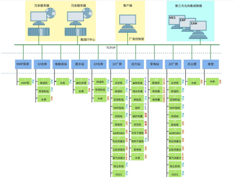 FMCS厂务控制系统包括变配电子系统、给排水子系统、空压子系统、真空子系统、 通风子系统、制冷子系统、空调子系统、软化水子系统、智能照明子系统、废气子系统 等集监测、计量、控制、管理于一体的动力能源管理系统。可实现能源动力系统的远程 集中监控,提高各子系统负荷随动的自动化程度;提升各子系统的运行可靠性;采用集 中排班、定期巡检的运行管理模式,节约人力资源;通过能源消耗统计、分析,为企业节能减排;为企业实现全厂信息化管理打下一定基础等。